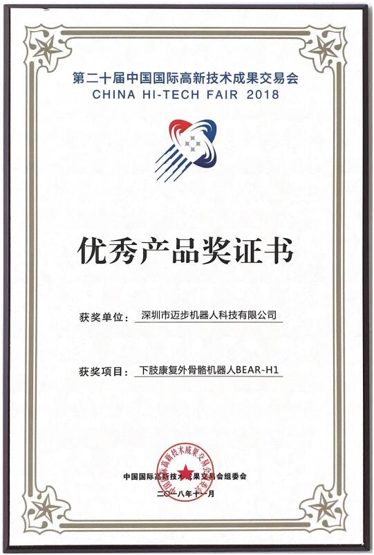 2018年11月18號,邁步機器人產品“下肢康復外骨骼機器人BEAR-H1榮獲”第二十屆中國國際高新技術成果交易會(簡稱高交會)優秀產品獎。